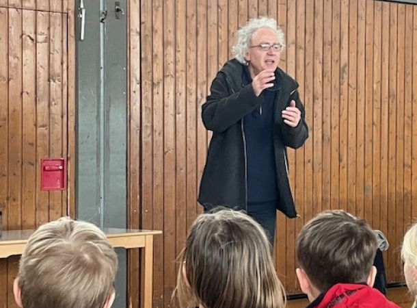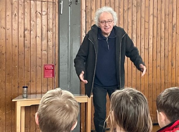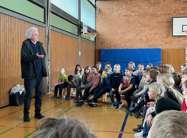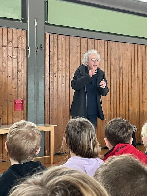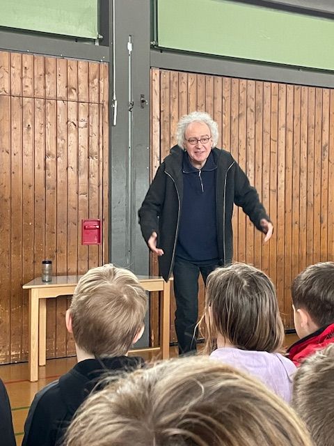 Am 6. Februar 2024 lud Herr Vogelwaid bei klassisch graulkaltem Wetter zur Märchenstunde in die Turnhalle. In zwei altersgemäß abgestimmten Erzählrunden brachte er den Kindern mit seiner ruhigen und spannungsvollen Stimme einige hauptsächlich ́alte ́ Märchen näher, von denen zuvor noch niemand gehört hatte. Da waren z.B. „Der dreiköpfige Drache“, „Der halbe Hahn“, „Der Teufel ist Tod“ und der „Findevogel“. Als anfänglich ein Zuhörer kritisierte: „Das geht doch gar nicht“, konterte Herr Vogelwaid mit den Worten: „Es ist doch aber ein Märchen, oder? Da ist alles möglich!“ Damit waren alle sofort einverstanden. Der Erzähler verstand es, durch kleine Aufgaben die Aufmerksamkeit der Kinder auf die Geschichten zu lenken. Auch wenn alle Märchen schlichtweg Grausames beinhalten, übten sie dennoch eine faszinierende Zuhörwirkung auf die Kinder aus, die Zugaben forderten.